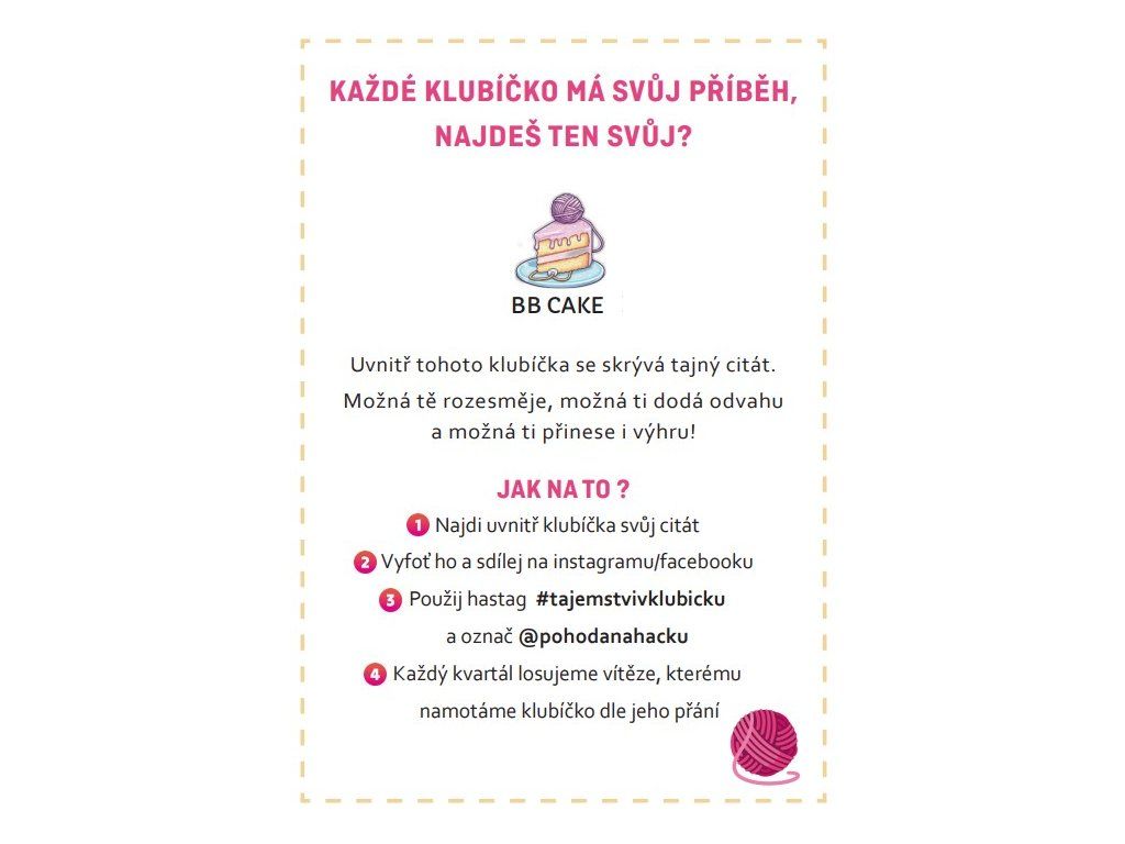 - každé naše klubíčko BB Cake ukrývá tajný citát. Když ho najdeš a nasdílíš na sociálních sítích s hashtagem #tajemstvivklubicku, budeš zařazena do soutěže