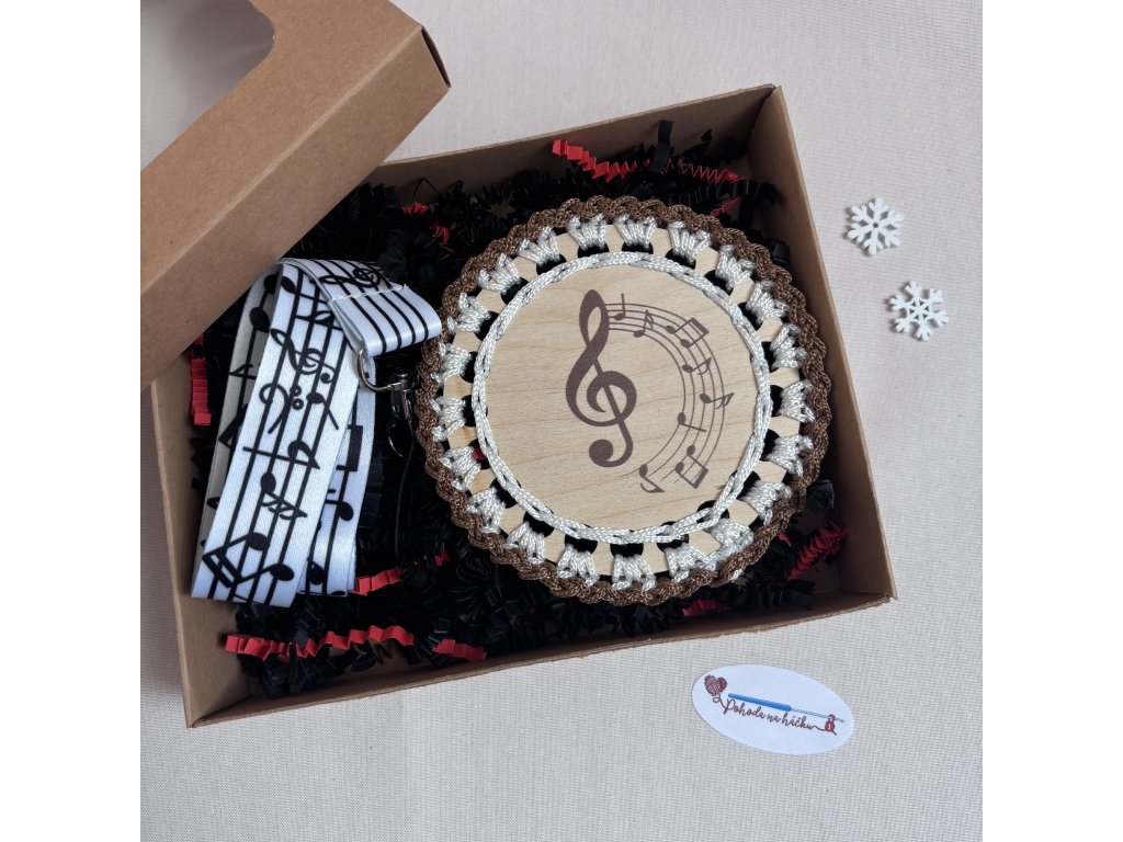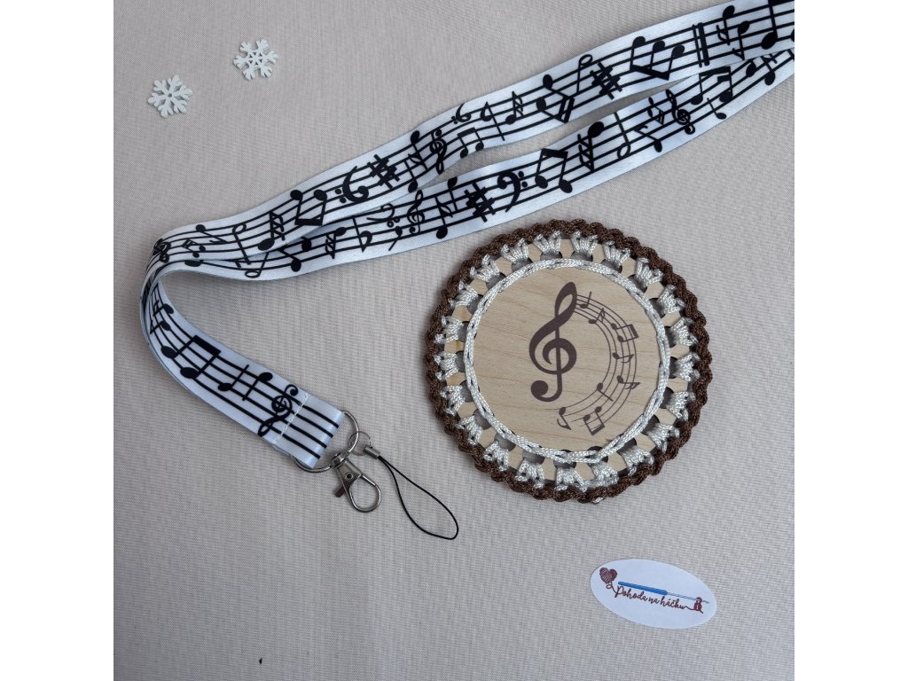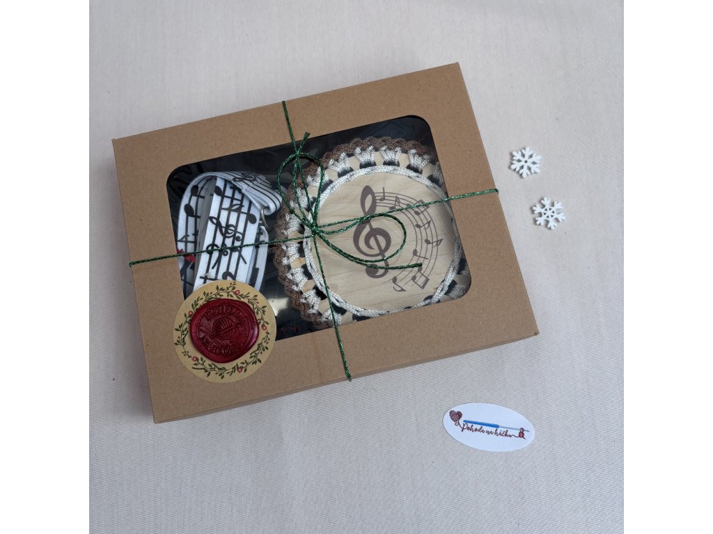 - Ručně obháčkovaný podtácek: s motivem houslového klíče a notové osnovy, který potěší každého hudebníka