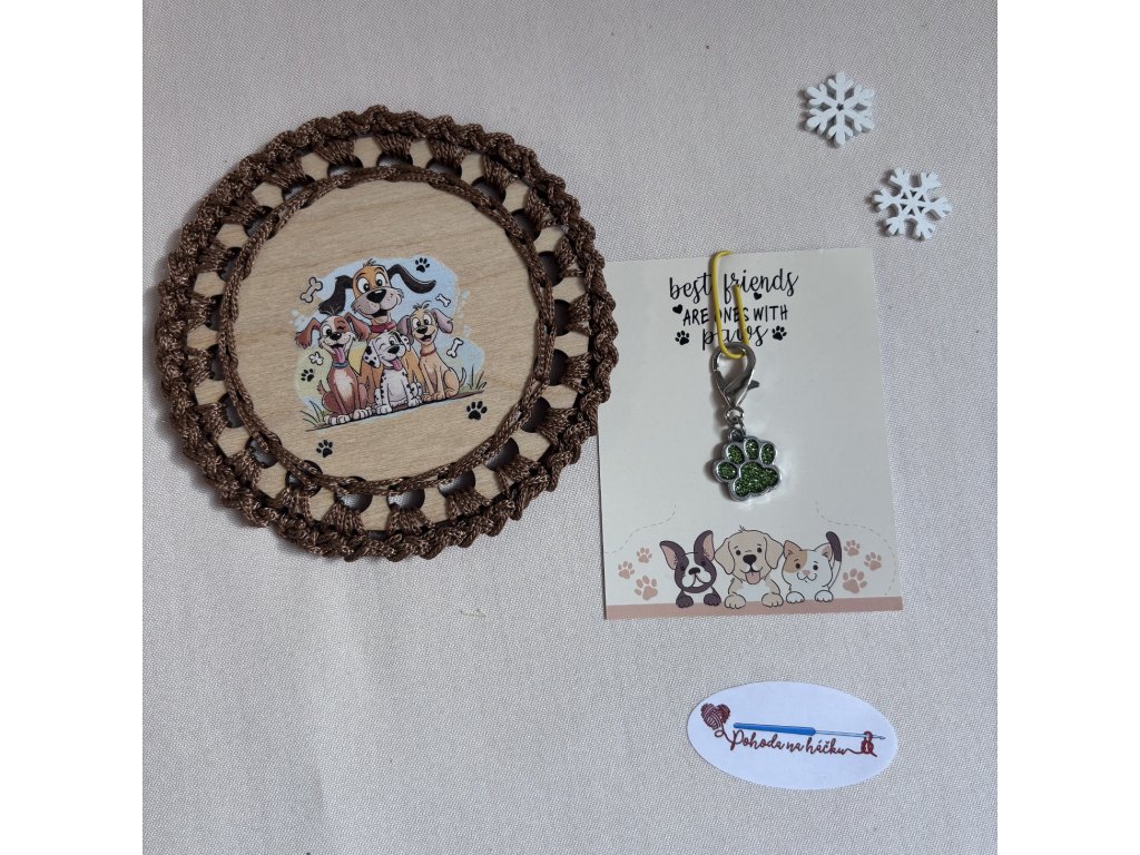 Ručně obháčkovaný dřevěný podtácek : není nic krásnějšího, než si po náročném dni vychutnat šálek kávy nebo čaje, který odložíš na tento nádherný a vtipný podtácek se psí smečkou.