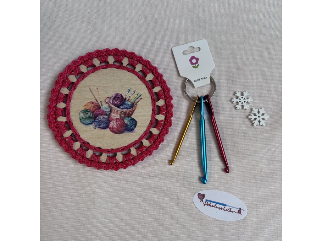 Ručně obháčkovaný dřevěný podtácek : není nic krásnějšího, než si po náročném dni vychutnat šálek kávy nebo čaje, který odložíš na tento nádherný podtácek se stylovým motivem.