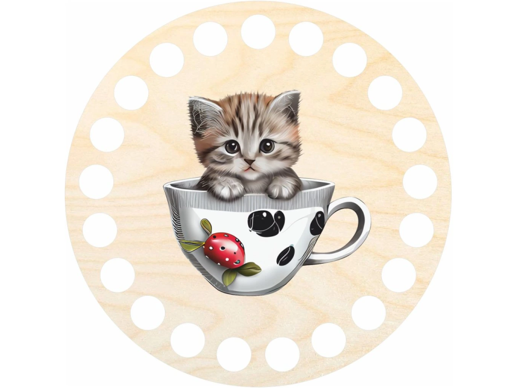 Dřevěný podtácek nebo víko na košík - kotě v hrnku