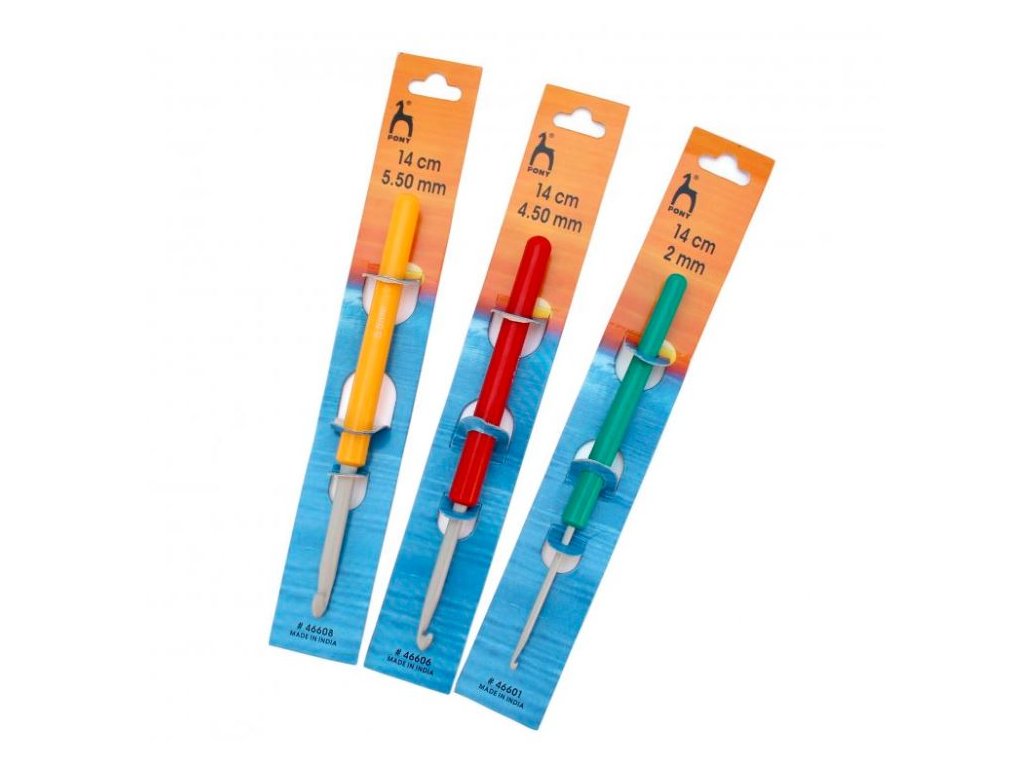 Hliníkový háček na háčkování s kulatou plastovou rukojetí pro lepší uchopení, zn.Pony.
