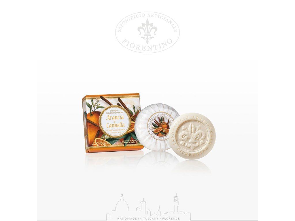 100% rostlinné ručně vyráběné mýdlo s pomerančem a skořicí z Italské mýdlárny Saponificio Artigianale Fiorentino, která vyrábí výjimečně zpracovaná luxusní mýdla.