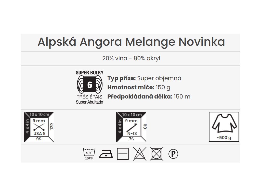 Klubíčko Alpine Angora Melange má návin cca 150 metrů a váží 150 gramů, složení příze 20% Vlna a 80% akryl.